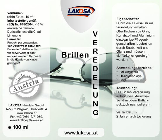 Durch die Lakosa Brillen Veredelung erhalten Oberflächen aus Glas, Kunststoff und Aluminium einzigartige Pflegeeigenschaften, bestechen durch Sauberkeit und Glanz und müssen viel seltener gereinigt werden.